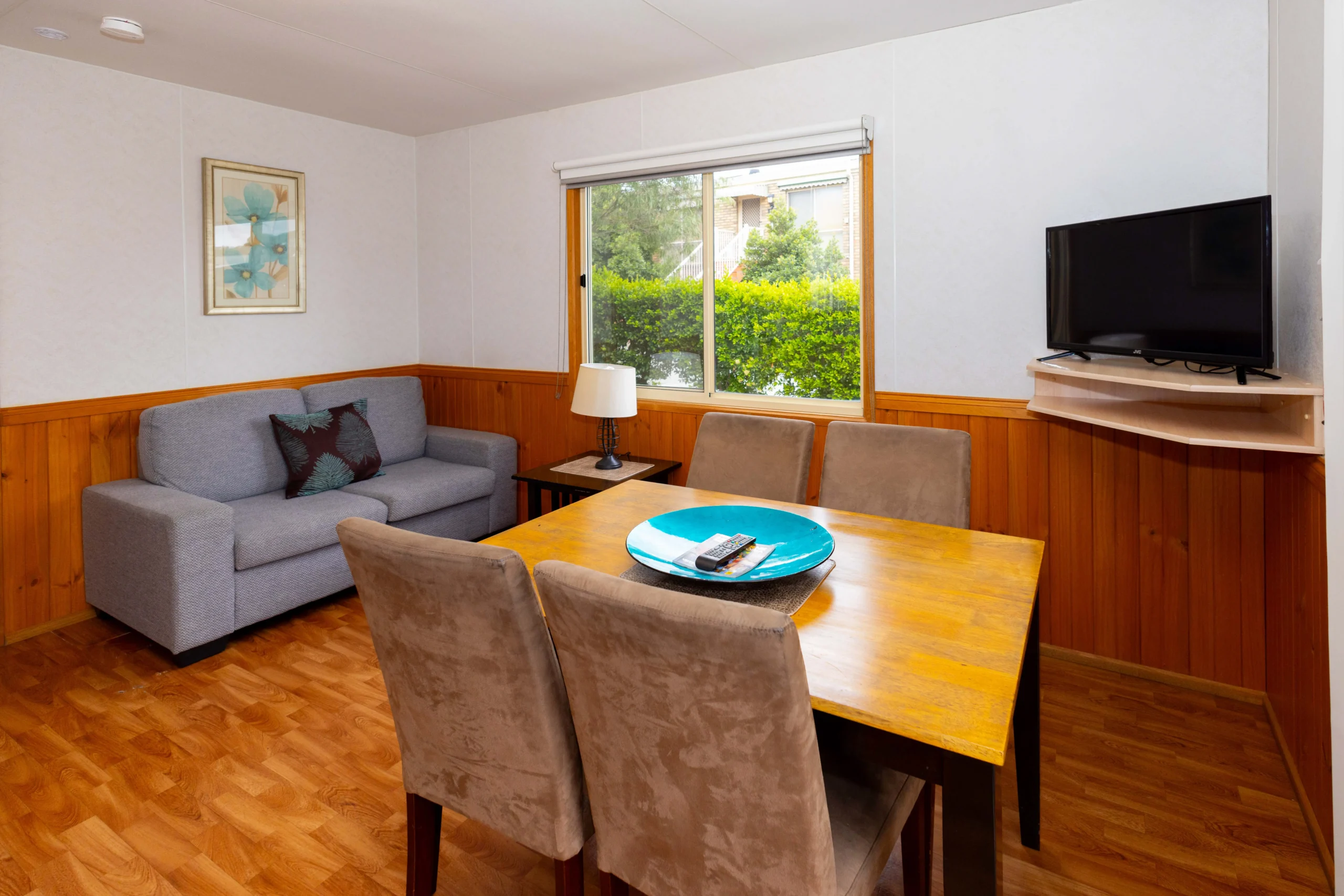 The main bedroom is thoughtfully furnished with a queen bed, complete with fresh linen and cozy doona to keep you warm on chilly nights. The cabin also includes a well-appointed bathroom suite with a vanity, mirror, shower, toilet, and a hair dryer. For your convenience, the fully equipped kitchen boasts a full oven, stove, fridge/freezer, and all necessary pots, pans, utensils, crockery, and cutlery, making meal preparation a breeze. Unwind in the comfortable living area with a plush couch, enjoy year-round climate control with reverse cycle air-conditioning, and stay entertained with a flat-screen television and DVD player.
