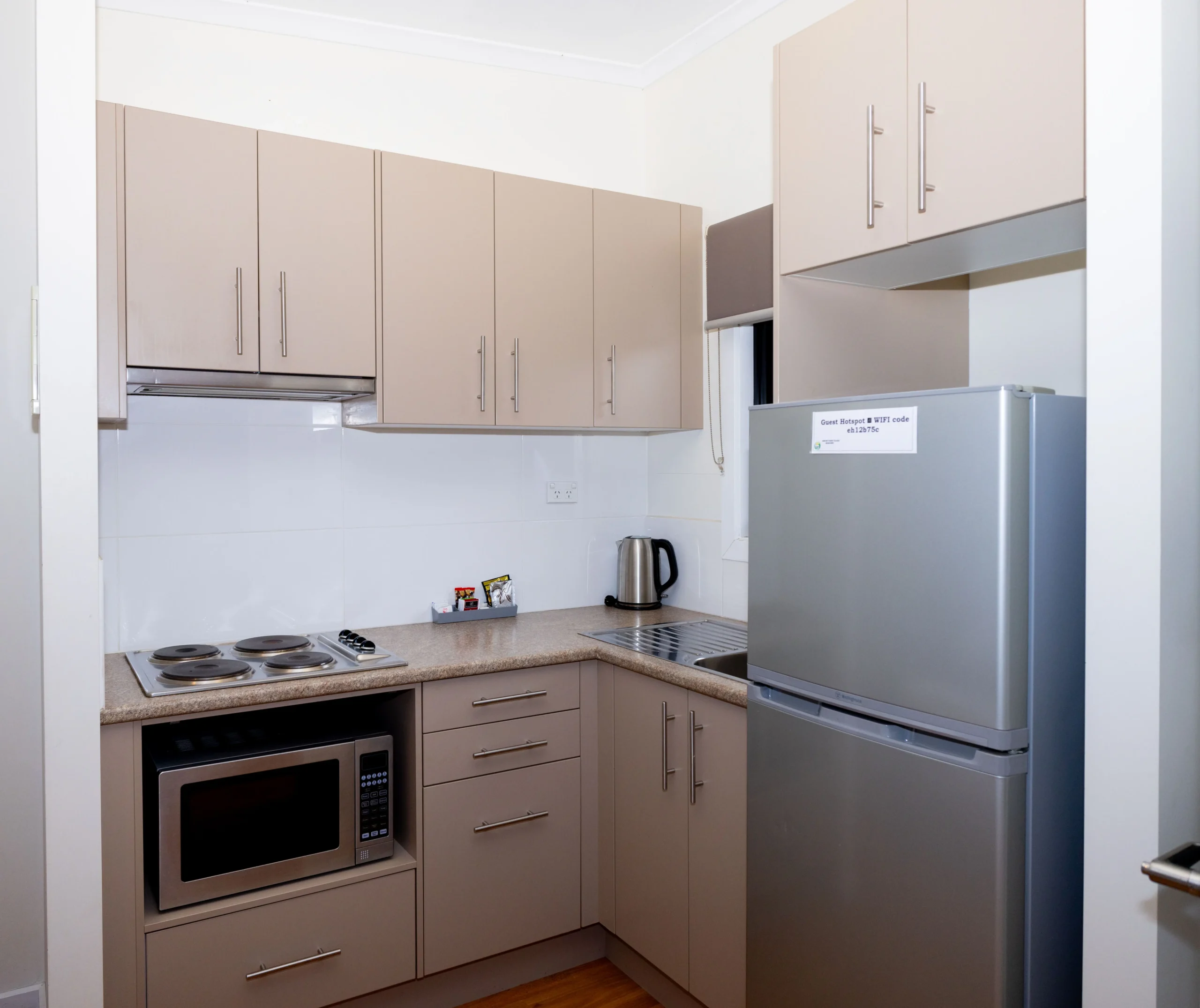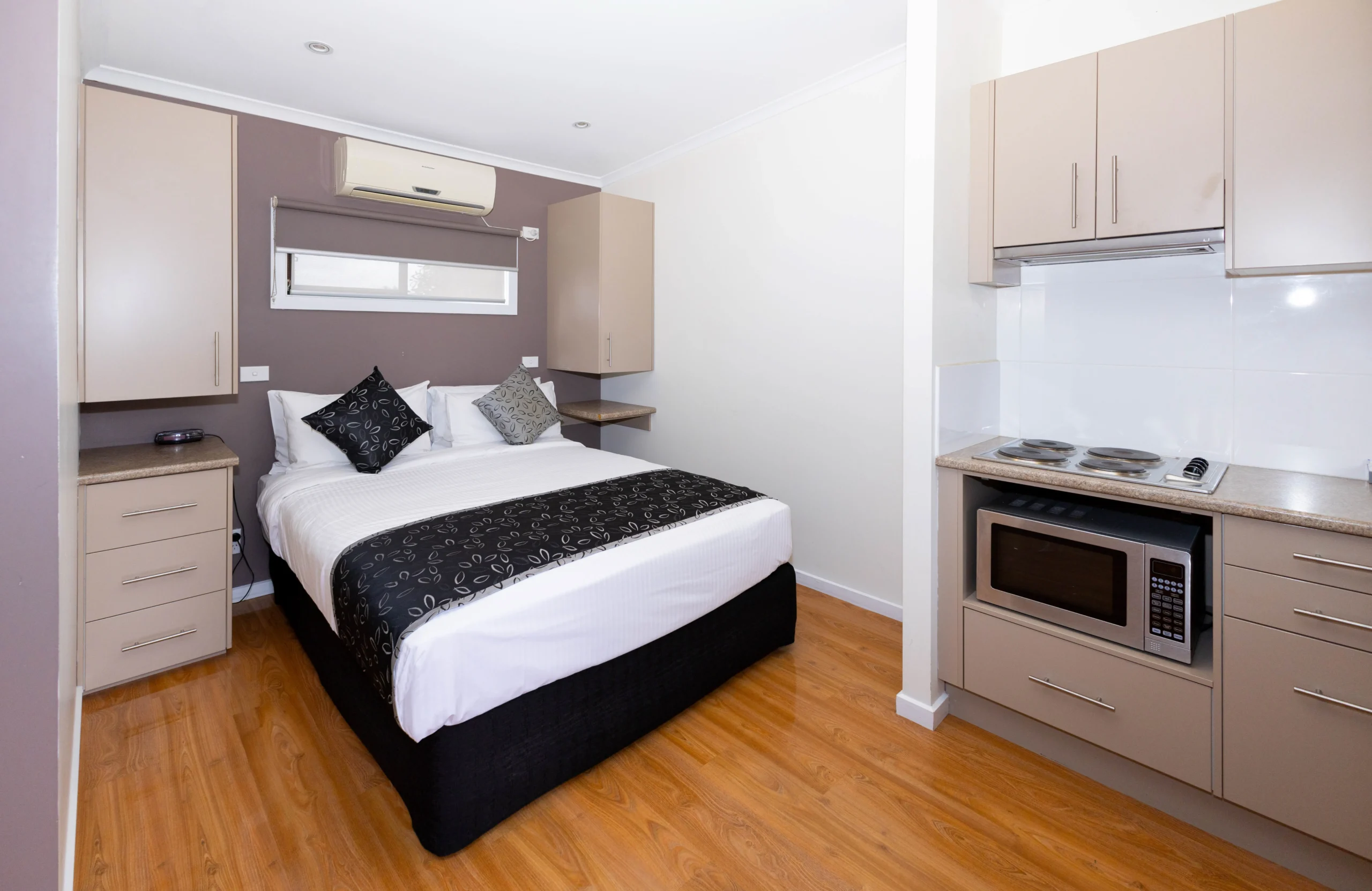 Our Studio Accessible Cabins are perfect for those requiring wheelchair or easy access. This open plan studio features a queen bed with fresh linen, and an accessible bathroom with a shower and toilet. For added convenience, you’ll find a microwave, mini fridge/freezer, crockery, and cutlery. Relax in the inviting living area with a soft couch, and enjoy year round comfort with reverse cycle air conditioning.